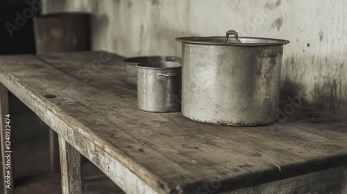 Rustic kitchen, old pots, wooden table, worn walls, historical setting, stock photo