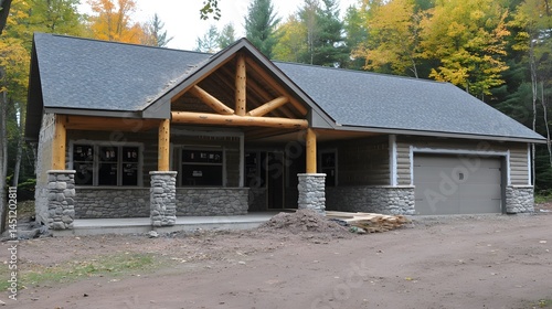 rustic, log cabin, home, exterior, stone, garage, autumn, tree, wood, house, building, architecture, design, residential, real estate, property, countryside, nature, landscape, fall, leaf, grey, grey, roof, porch, window, door, construction, new, modern, contemporary, stone house, autumn color