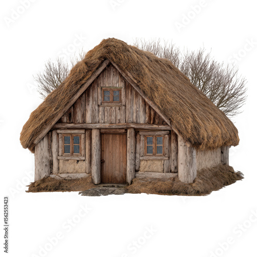 Rustic medieval thatched roof cottage with wooden door and windows isolated on transparent background