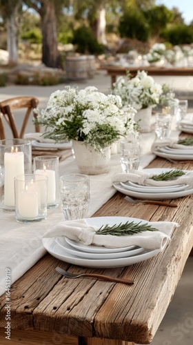 Rustic Outdoor FarmToTable Dinner Setting with White Flowers and Candles