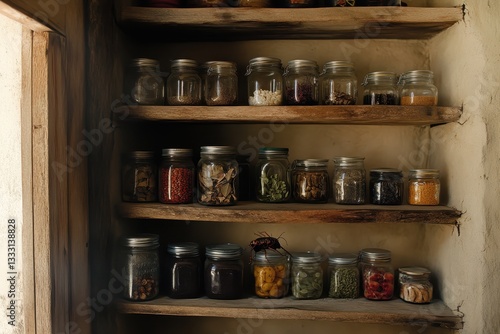 Rustic Pantry Shelves Displaying Various Jars of Spices and Herbs