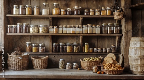 pantry, jar, grain, spice, storage, rustic, wooden, kitchen, shelf, organised, traditional, food, ingredient, sustainable, dry goods, homestead, home, natural, cosy, interior, lifestyle, preserved, organic, culinary, wholesome, vintage, healthy, bulk, decor