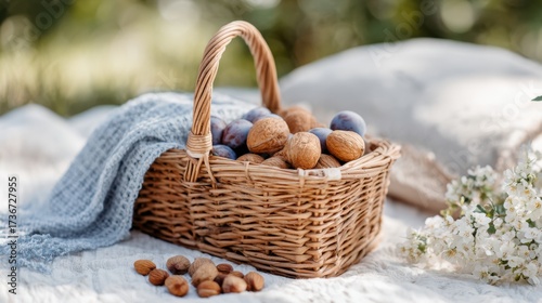 Rustic picnic basket with walnuts, plums, and cozy blanket outdoor setting