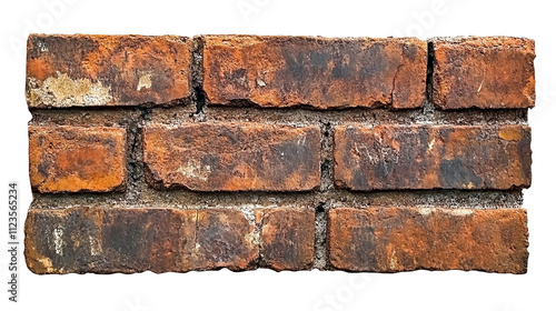 Rustic red brick wall with weathered texture on white isolated background.