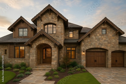 Rustic Stone & Wood Home: Arched Entry, Wood Trim, and Attached Garage