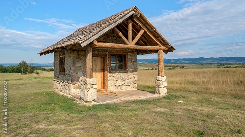 Rustic stone cabin in a grassy field under a blue sky. Potential use Stock photo for nature, travel, or outdoor living themes
