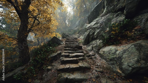 Rustic stone staircase winding through golden autumn forest with rocky landscape – peaceful nature trail, serene outdoor path, fall foliage, tranquil environment, scenic hiking scene, natural beauty.