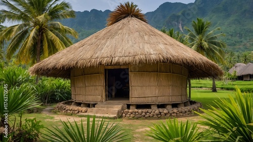 Rustic Village Home: Traditional Palm Thatched Roof in a Serene Countryside