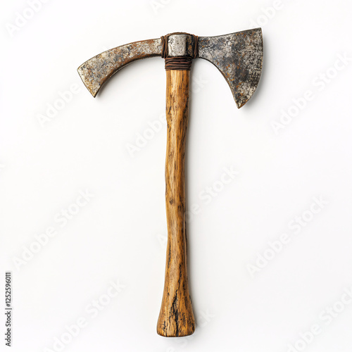 axe, hatchet, tool, weapon, wood, handle, steel, rustic, vintage, sharp, blade, brown, grey, white, isolated, background, antique, old, weathered, simple, rural, primitive, lumberjack, forest, nature, outdoors, craftsmanship, hand-made, bricolage, cutting, chopping, carpenter's shop, carpenter's shop, survival, camping, hunting, history, traditional, historical, heritage, archaeologic, archaeology