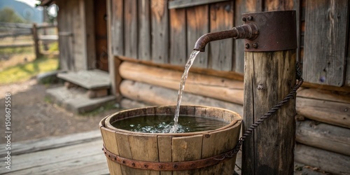 Rustic Water Well Metal Faucet Pouring into Wooden Bucket, Homestead , Vintage