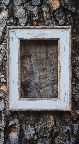 Rustic White Wooden Frame Against Tree Bark Texture