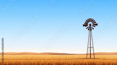 Rustic Windmill Surrounded by Endless Golden Wheat Fields Under Clear Blue Sky