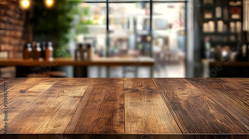 Rustic Wood Table Top With Blurred Cafe Backdrop, Ideal For Product Mockups And Food Photography. Warm, Inviting Texture.