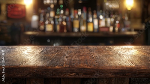 Rustic Wooden Bar Counter with Blurred Background of Liquor Bottles