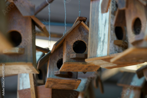 Rustic Wooden Bird Houses Hanging in an Artisan Market Display