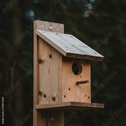 Rustic wooden birdhouse crafted from natural planks, emphasizing texture and simple construction for wild backyard birds, habitat, natural, brown