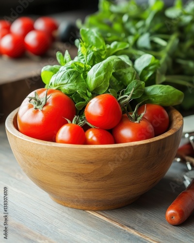 tomatoes, basil, bowl, wooden, fresh, red, green, tabletop, rustic, food, ingredient, healthy, nourishment, vegetable, herb, cooking, cookery, organic, natural, diet, vegetarian, vegan, vitamin, delicious, culinary, plant, garden, harvest, ripe, juicy, vibrant, bright, close, up, still, life, background, wood, table, kitchen, meal, dish, salad, snack, raw, produce, summer, aroma