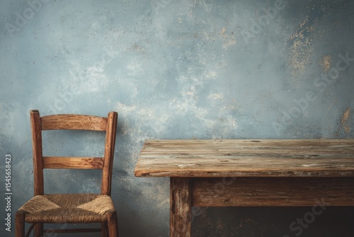 Rustic wooden chair and table against a textured blue wall. A simple, weathered scene suggesting solitude or contemplation