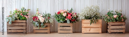 Rustic wooden crates filled with vibrant floral arrangements against a wooden wall backdrop, perfect for weddings or home decor inspiration.