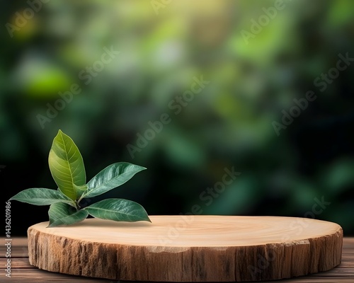 wood, wooden, rustic, display, leaf, green, foliage, blurred, background, nature, organic, natural, table, surface, circular, round, platform, racked, product, presentation, showcase, environment, eco, sustainable, fresh, vibrant, healthy, growth, spring, summer, plant, greenery, texture, grain, brown, light, shadow, calm, serene, peaceful, tranquil, minimalist, simple, clean, design, aesthetic, beauty, image