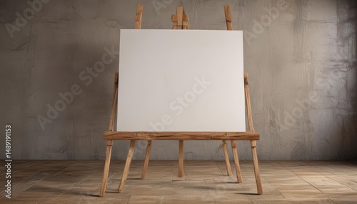 Rustic wooden easel base, blank canvas prominent , studio, painting