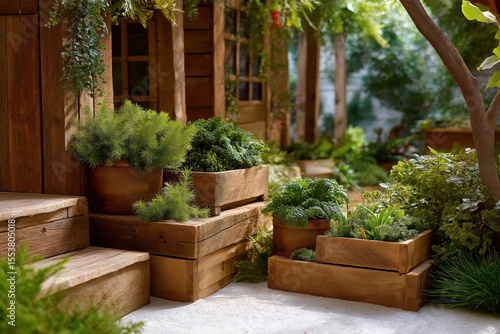 garden, wooden, rustic, lush, greenery, vegetation, natural, landscape, backyard, foliage, plant, environment, green, nature, serene, tranquil, peaceful, flora, leaf, horticulture, growth, blossom, wood, brown, box, container, step, porch, sunlight, tree, shrubbery, potted, terrace, exterior, summer, spring, arrangement, decoration, setting, high-coloured, fresh, healthy, vibrant, architecture, design, earth