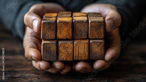 Rustic wooden puzzle held by hands showcasing creativity and problem-solving skills in a warm atmosphere