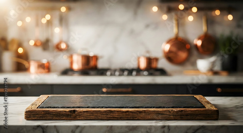 Rustic wooden serving board on marble countertop in cozy kitchen setting