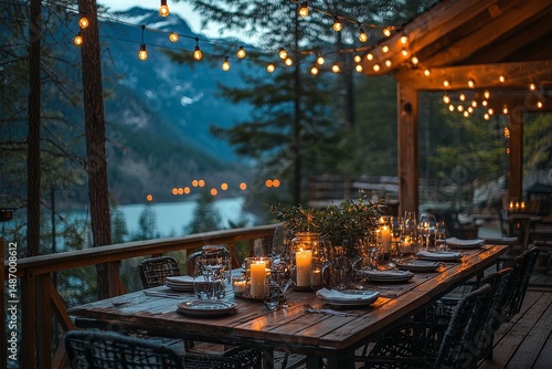 rustic, wooden, table, dinner, cosy, cabin, deck, mountain, dusk, string, light, candle, warm, atmosphere, casual attire, dining, nature, forest, wood, landscape, evening, scenic, peaceful, relaxation, natural, environment, comfortable, space, home, seating, hospitality, gathering, ambient, soft, glowing, traditional, romantic, intimate, rural, countryside, timber, authentic, inviting, naturalistic, fresh, calm