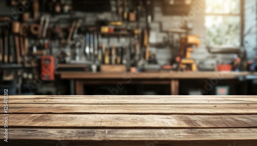 Rustic Wooden Tabletop with Blurred Workshop Background