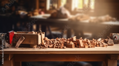 Rustic woodworking table with and blurred wood working tools background