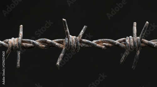 Rusty barbed wire close up against dark black isolated background, sharp edges closeup. Restriction and barriers, security or imprisonment. Danger or protection.