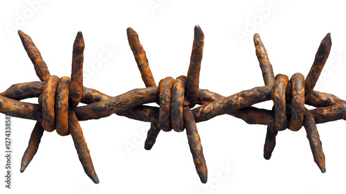 Rusty Barbed Wire Vintage Metal Texture, Aged Iron Fence with Sharp Brown Detail, isolated on transparent background.