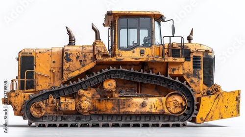 Rusty bulldozer profile on white background. Possible use Industrial machinery, construction concept