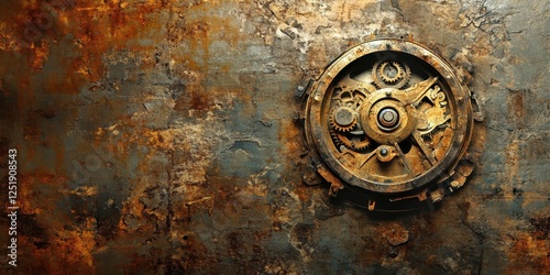 Rusty gears embedded in distressed metallic wall industrial aesthetic