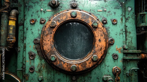 Rusty industrial porthole, factory background, grunge texture, design element