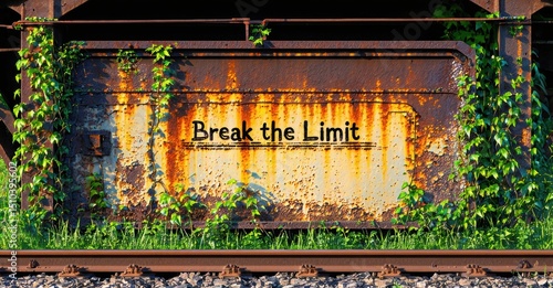 Rusty metal doorway covered with vines. Text reads Break the Limit. Railroad tracks below, dark background. Dramatic lighting creates strong contrast.