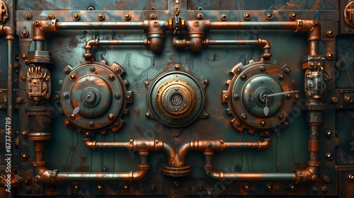 rusty, metal, rectangular frame made of pipes and gears, steampunk style