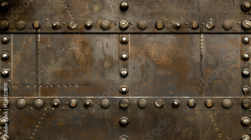 Rusty metal surface with rivets and bolts, showcasing industrial texture and design. weathered appearance adds character and depth to material