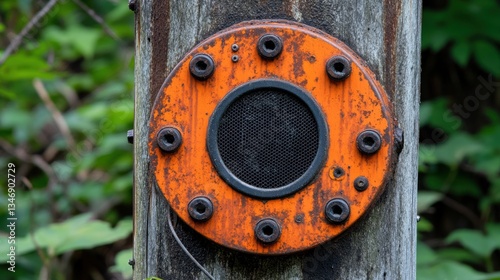 device, rust-eaten, orange, circular, wooden, post, metal, speaker, sound, alert, warning, communication, installation, equipment, utility, pole, nature, forest, vegetation, foliage, green, brown, industrial, maintenance, repair, protection, safety, security, monitoring, transmission, signal, signalling, technology, hardware, component, electronic, construction, infrastructure, environment, outdoors, detail, closeup, image, photo, rural, abandoned, vintage, weathered