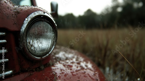 truck, vintage, headlamp, red, rust-eaten, mud, wet, field, countryside, rural, old, classic, retro, automobile, vehicle, transportation, farming, agriculture, dirt, water, drop, detail, closeup, nature, landscape, exterior, metal, glasses, chrome, detail, classic car, american, nostalgia, photo, vintage car, rusty metal, driving, road, travel, history, abandoned, isolated, primitive, rough, dust, damp, country, rustic