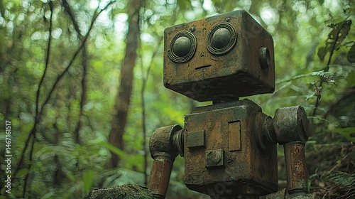 robot, rust-eaten, figure, wooden, forest, green, jungle, nature, outdoors, detail, closeup, environment, machinery, metal, antique, aged, rustic, technology, futuristic, industrial, machine, design, wood, plant, flora, fauna, brown, dark, photo, still, image, composition, object, subject, texture, construction, perspective, environmental, isolated, landscape, view