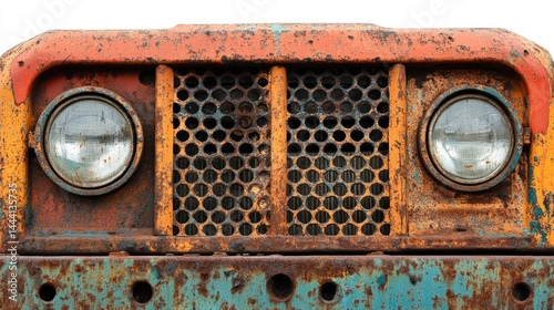 rust-eaten, tractor, grill, front, metal, old, weathered, damaged, vehicle, machinery, industrial, farm, orange, yellow, green, blue, paint, corrosion, rusted, detail, closeup, texture, background, closeup, vintage, equipment, agriculture, retro, aged, worn, construction, repair, maintenance, exterior, design, framework, grid, pore, protection, strength, power, utility, durability, work, tool, farming, rural, heavy, manufacturing