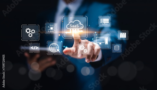 SaaS (software as a service) concept, Businessman touch virtual screen of SaaS icons for software services on cloud system. Internet and networking technology.