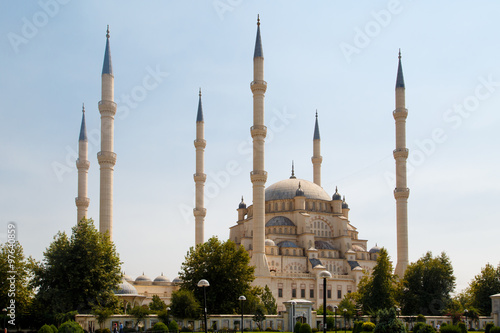 adana, arabic, architecture, blue, tree branch, building, day, daylight, dome, exterior, front view, garden, god, green, islam, islamic, minaret, mosque, nature, religion, religious, sky, stone wall, structure, summer, sun, sunlight, sunny, tree, turkey, wall