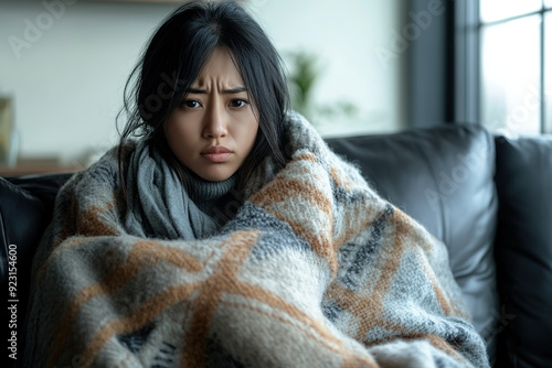 Sad Asian Woman Wrapped in Blanket on Sofa at Home, Experiencing Stomach Flu Symptoms and Emotional Suffering, Depicting Illness and Distress