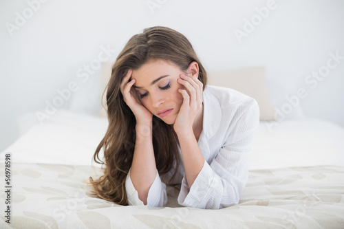 Sad casual brown haired woman in white pajamas lying on her bed
