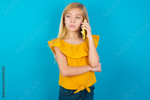 Sad Caucasian kid girl wearing yellow T-shirt against blue wall talking on smartphone. Communication concept.