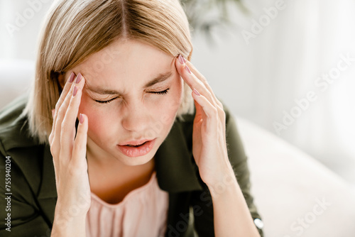 Sad caucasian woman having migraine rubbing temples. Young female girl suffering from headache, period crumps, having problems, being fired, crying at home