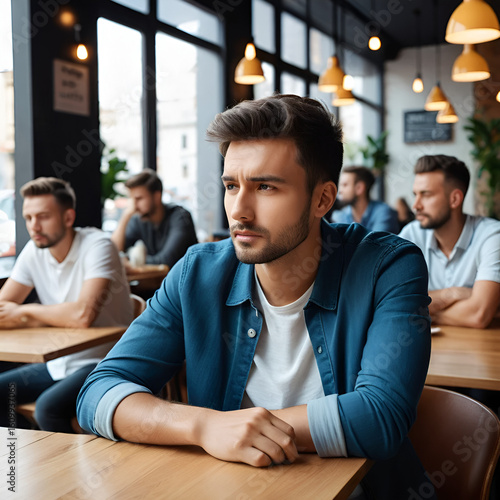 Sad guy sitting alone separately from other mates in cafe